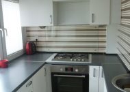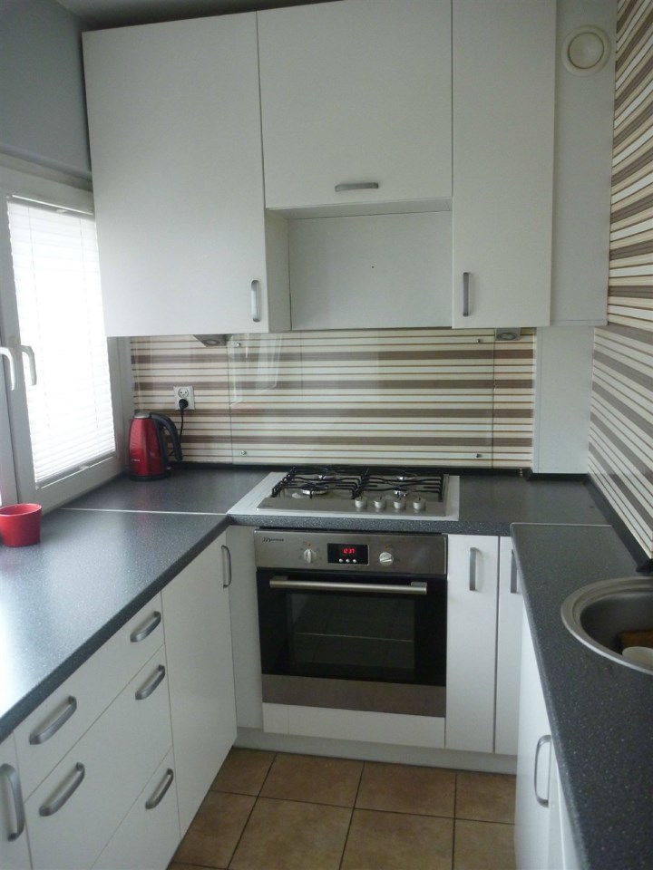 W kuchni nowoczesne szafki i sprzęty: lodówka, kuchenka gazowa i piekarnik elektryczny. W kuchni też stoi pralka.