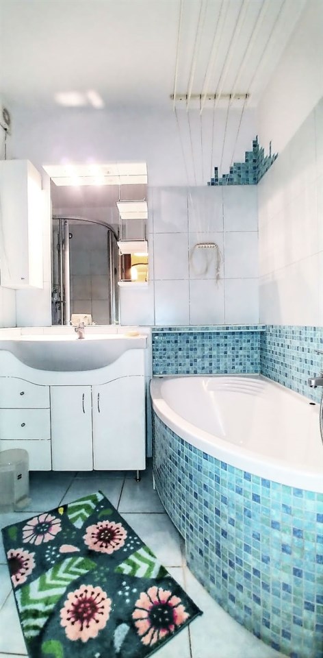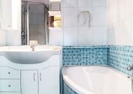 Łazienka z kabiną prysznicową, wanną i pralką.